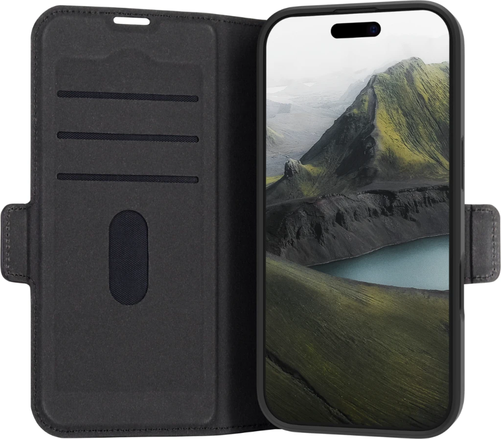 Oslo Pro ist eine stoßfeste Folio-Tasche aus recyceltem Kunststoff mit einer Oberfläche, die aussieht und sich anfühlt wie Leder. Dank der faltbaren Rückseite können Sie Videos im Querformat freihändig ansehen.